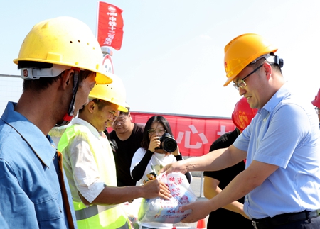 洪湖鵬一行來到市區快速路環線工程(一期)土建2標段施工現場,與建設工人一一握手,送上防暑慰問用品,感謝大家為快速路建設和嘉興城市建設所做的貢獻,并囑咐大家在高溫天氣要注意防暑降溫,保重身體。