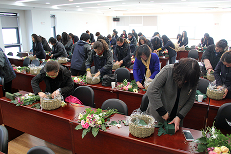 在隨后的插花藝術(shù)培訓(xùn)中,公司特別邀請(qǐng)了花藝?yán)蠋熯M(jìn)行現(xiàn)場講解。培訓(xùn)還沒開始,大家就已經(jīng)耐不住性子了,一個(gè)個(gè)都興致勃勃,躍躍欲試。課堂上,老師講得仔細(xì),大伙聽得認(rèn)真。在了解了基本技巧后,女同胞們便開始動(dòng)手實(shí)踐了,大家一邊插花,一邊交流,一邊互相取經(jīng),一邊向老師請(qǐng)教。為了使作品更富藝術(shù)性和創(chuàng)作性,大伙充分發(fā)揮想象力和創(chuàng)造力,將花籃搭配得錯(cuò)落有致,美不勝收,并紛紛拿出手機(jī)記錄這美好溫馨的瞬間。