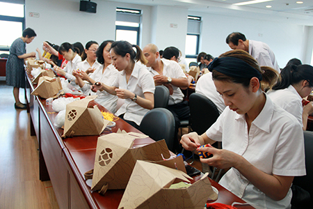 現(xiàn)場除了本就心靈手巧的女同胞外,還不乏許多看似“笨拙”的男同胞。然而,當(dāng)他們放下平時(shí)握慣的方向盤,拿起繡花針做起針線活時(shí),卻也絲毫不馬虎,穿針引線、縫合香包,架勢和手藝一點(diǎn)也不遜色。但兩個(gè)多小時(shí)做下來,他們也不禁感慨:“做香囊可比開汽車難多了,細(xì)心、耐心、恒心一樣都不能少,但能學(xué)到一門傳統(tǒng)手工藝術(shù),確實(shí)是一件很開心的事情!”雖然很多員工都是第一次自己動(dòng)手制作香囊,但大家都很認(rèn)真,仔細(xì)聆聽,主動(dòng)請(qǐng)教,當(dāng)看到自己辛辛苦苦的勞動(dòng)成果后,都紛紛拿出手機(jī)拍照,并發(fā)在微信朋友圈與朋友們分享。