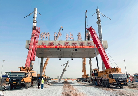 隨后,胡奕軍一行來到申嘉湖高速沿線施工現場,實地查看了收費站的入口治超稱重設備、新建ETC車道、ETC混合車道等建設改造情況,在施工現場深入了解自由流收費系統以及拼寬路段自由流ETC門架建設、浙滬北主線收費站拆除情況。